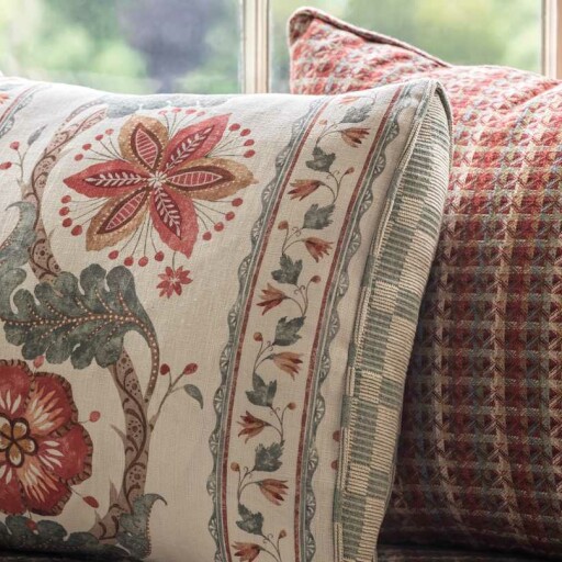 Výrazné stylizované květy prokládané akantovými listy jsou zobrazeny ve formě panelů. Motiv je lemován hřebenatkovými pruhy s popínavými květy a listy. Inspirováno indickým závěsem z 18. století.
