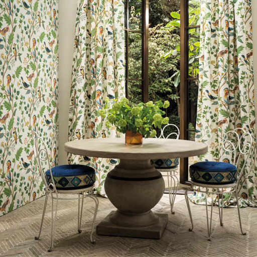 Beautiful decorative birds are intricately painted, perch on leafy trailing branches. Printed on linen. The Mayani Bird Sanctuary is a famous bird sanctuary in India.