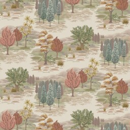 A charming depiction of stylised Indian trees. The colourways encompass various shades of green with golden accents, capturing a natural ambience.