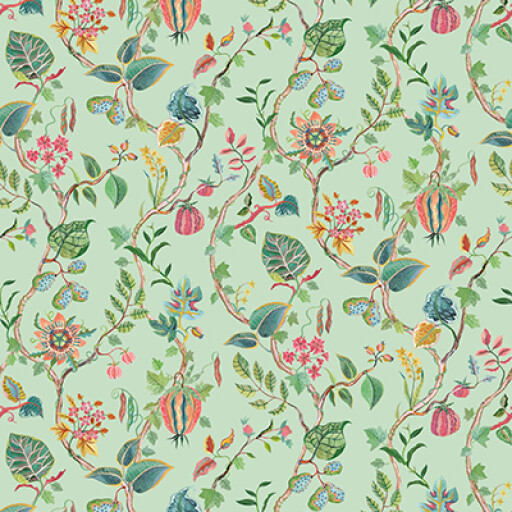 An imaginative trailing design of passion fruit flowers, seed pods and decorative gourds.