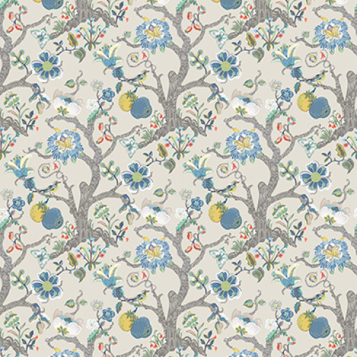 A fantastical tree is adorned with colourful fruits and flowers, a bird and a butterfly.