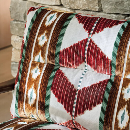 Tkanina s hravým pruhovaným motivem zobrazuje ikat vzory se střiženým a nestřiženým sametem doplněné složitě tkanými detaily.