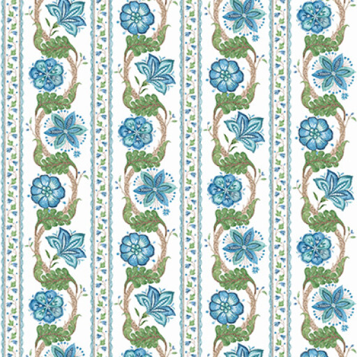Inspired by an 18th century Indian chintz hanging, panels of bold stylised flowerheads interspersed with acanthus leaves are bordered by a scallop edge stripe of trailing flowers and leaves.