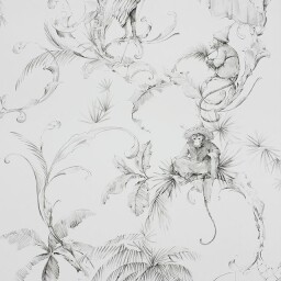 Reimagines a classic toile with influences from Greek ornamental gardens, where decorative columns and sculpted urns sit amidst lush foliag.